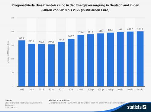 Die Statistik veranschaulicht die prognostizierte Umsatzentwicklung in der Energieversorgung in Deutschland in den Jahren von 2013 bis 2025. Im Jahr 2025 wird der Umsatz in der Energieversorgung in Deutschland laut der Prognose rund 402