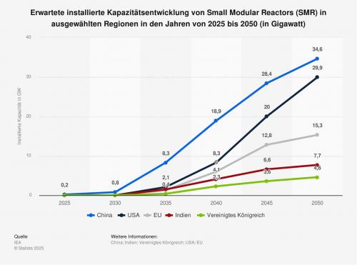 Bis zum Jahr 2050 soll China Prognosen zufolge Small Modular Reactors (SMR) mit einer installierten Kapazität von knapp 35 Gigawatt besitzen. In der EU werden SMR mit einer Kapazität von rund 15 Gigawatt erwartet. SMR sind kleine, vorgefertigte Kernspaltungsreaktoren, die im Vergleich zu herkömmlichen Kernkraftwerken mehr Flexibilität und Vielseitigkeit bieten sollen.