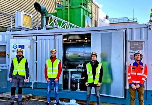 v.l. Cornelius Randing, Vinzent Ruf, Johan Tallgren, und Aki Braunschweiler vor der Containeranlage in Espoo beim Abschluss des HySTOC-Projects im Mai 2022 Quelle: Hydrogenious LOHC Technologies |