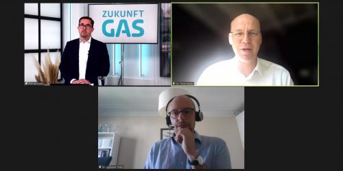 V.o.l.: Charlie Grüneberg, Timm Kehler (beide Zukunft Gas) und Johannes Trüby (Deloitte) diskutierten über den künftigen Wasserstoffmarkt Bild: E&M |