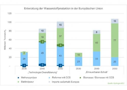 | Die Entwicklung der Wasserstoffproduktion in der EU in den beiden untersuchten Technologiepfaden |