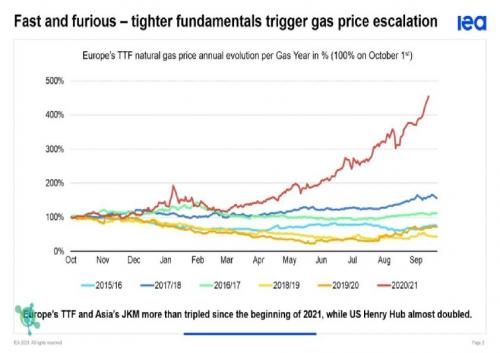 Preisentwicklung am Gasmarkt im Vergleich der Jahre 2015 bis 2021 Quelle: IEA Zum Vergrößern bitte auf die Grafik klicken |