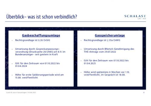 Allerdings könnten trotzdem einige Gasversorger in Schwierigkeiten geraten, befürchten die Rechtsexpertinnen. So müssen sie bei zeitlichen Verzögerungen in der Weitergabe der Umlagen das Geld vorstrecken oder ganz allein tragen. Zudem würden ihnen die Gasmengen des Vorjahres als Grundlage der Umlagen berechnet. Wenn die Kunden aber wegen diverser Sparmaßnahmen tatsächlich weniger Gas verbrauchen, bekommen sie über die Abrechnung des tatsächlichen Verbrauchs auch weniger Umlage zurück.