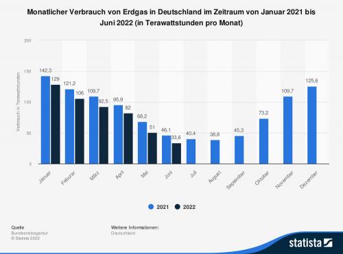 Mrd. kWh weniger als im Vorjahresmonat. Darüber hinaus wurde bisher im Jahr 2022 (Stand Juli) deutlich weniger Erdgas verbraucht als zur gleichen Zeit im Vorjahr. Begründet wird dies unter anderem mit milderen Temperaturen.