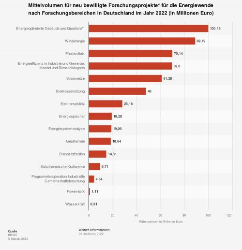 Die Statistik zeigt die Mittelvolumina für neu bewilligte Forschungsprojekte für die Energiewende in Deutschland im Jahr 2022 nach Zahlen des Wirtschaftsministeriums (BMWK). Im Jahr 2022 wurden Forschungsprojekte im Bereich Windenergie mit 89,19