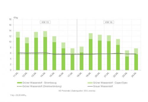 Wasserstoffpreisindex für Kalenderwoche 15 und 16 (zum Vergrößern bitte auf die Grafik klicken) Quelle: enervis energy advisors GmbH / EEX |