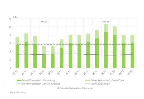 | Wasserstoffpreisindex in den Kalenderwochen 47 und 48. Zur Vollansicht bitte auf die Grafik klicken Quelle: enervis energy advisors GmbH / EEX |