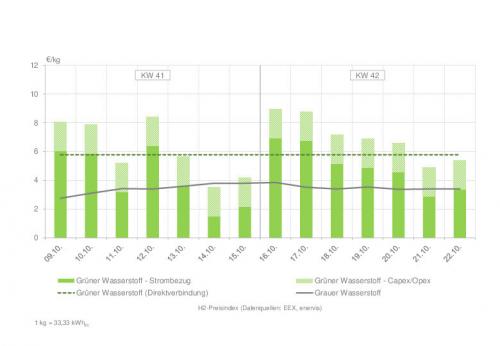 | Wasserstoffpreisindex in den Kalenderwochen 41 und 42 (zum Vergrößern bitte auf die Grafik klicken) Quelle: enervis energy advisors GmbH / EEX |