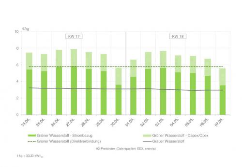 Wasserstoffpreisindex für die Kalenderwochen 17 und 18 Quelle: enervis energy advisors GmbH / EEX |