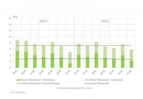 | H2-Preisindex für die Kalenderwochen 21 und 22 (zur Vollansicht bitte auf die Grafik klicken) Quelle: enervis energy advisors GmbH / EEX |