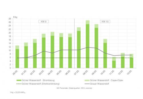 Euro/kg. Somit waren die Gestehungskosten von grünem Wasserstoff am Strommarkt weiterhin nicht wettbewerbsfähig, mit einer Ausnahme am 11. März. Das hohe Preisniveau für grauen Wasserstoff sorgte im betrachteten Zeitraum für einen klaren Vorteil der Insellösung aus Erneuerbare-Energien-Anlage und Elektrolyseur. Grüner Wasserstoff kann über eine Direktverbindung derzeit deutlich günstiger produziert werden (knapp 6
