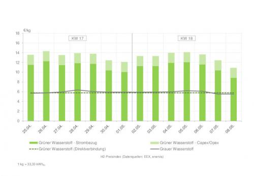 | H2-Preisindex in der Kalenderwoche 17 und 18 (zum Vergrößern bitte auf die Grafik klicken) Quelle: enervis energy advisors GmbH / EEX |
