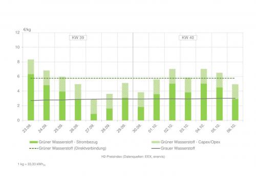 | Wasserstoffpreisindex in den Kalenderwochen 39 und 40 (zur Vollansicht bitte auf die Grafik klicken) Quelle: enervis energy advisors GmbH / EEX |