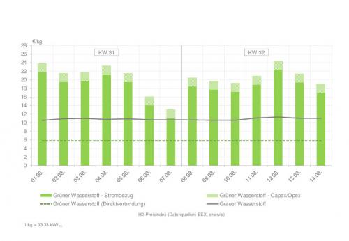 | Wasserstoffpreisindex in der Kalenderwoche 31 und 32 (zum Vergrößern bitte auf die Grafik klicken) Quelle: enervis energy advisors GmbH / EEX |