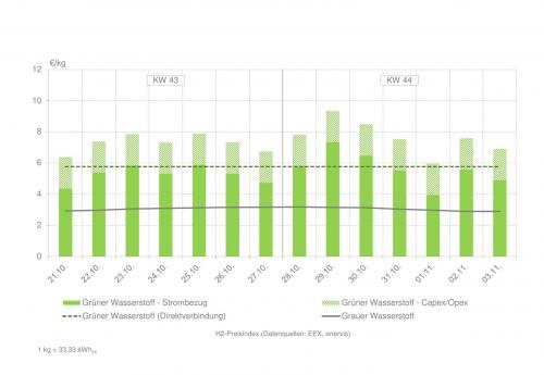 | H2-Preisindex in den Kalenderwochen 43 und 44 (zur Vollansicht bitte auf die Grafik klicken) Quelle: enervis energy advisors GmbH / EEX |