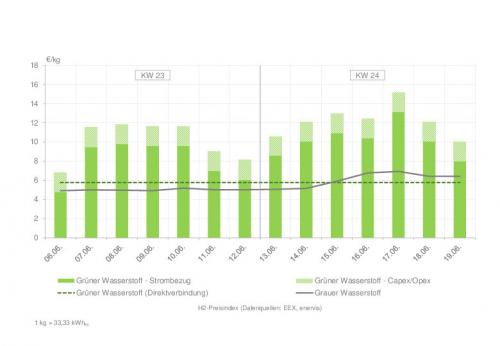 | Wasserstoffpreisindex in der Kalenderwoche 23 und 24 (zum Vergrößern bitte auf die Grafik klicken) Quelle: enervis energy advisors GmbH / EEX |