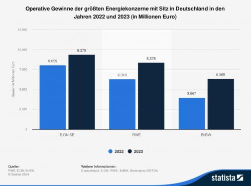 Zwischen den Jahren 2022 und 2023 konnte RWE seinen Gewinn beziehungsweise bereinigtes Ebitda von rund 6,3 Milliarden Euro auf knapp 8,4 Milliarden Euro steigern. Diese Entwicklung kann unter anderem mit den gestiegenen Energiekosten begründet werden.