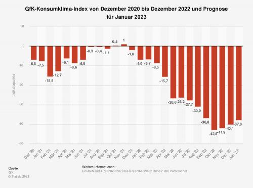 Der GfK-Konsumklima-Index lag im Dezember 2022 bei einen Indexwert von minus 40,1 Punkten. Für den Januar prognostiziert die GfK für das Konsumklima einen Wert von minus 37,8 Punkten und damit eine weitere leichte Verbesserung. Laut GfK hat sich die Verbraucherstimmung im Dezember weiter stabilisiert und damit ein weiteres Rekordtief der Verbraucherstimmung abgewendet. Zuletzt gab es einen solchen Absturz wie in den letzten Monaten zu Beginn der Corona-Krise im Frühjahr 2020. Der GfK-Konsumklima-Index misst die aktuelle Konsumneigung der Privathaushalte in Deutschland.