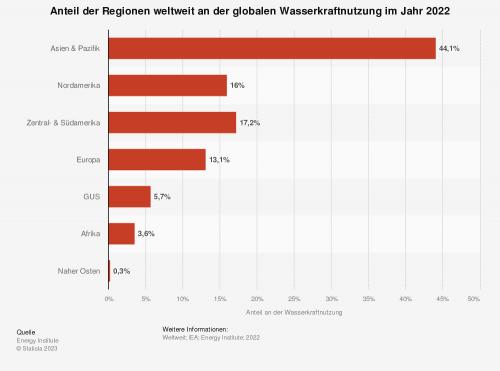 Die Statistik zeigt den Anteil der Regionen weltweit an der globalen Wasserkraftnutzung im Jahr 2022 nach Zahlen des Energy Institute. Im Jahr 2022 nutzen asiatische Länder, allen voran China, rund 44