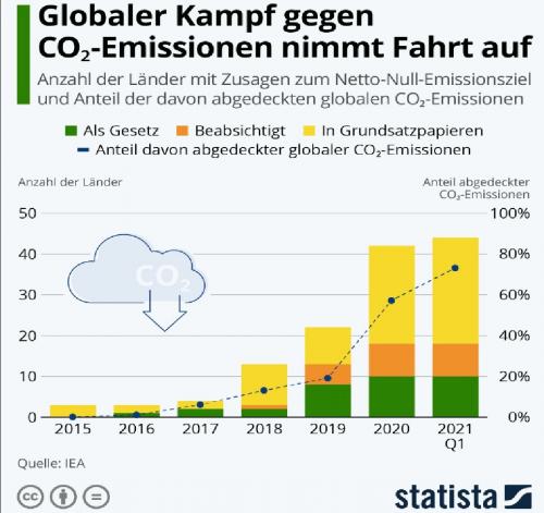 Im Kampf zur Reduzierung der weltweiten CO₂-Emissionen gibt es Fortschritte. Das zeigt die Statista-Grafik auf Basis von Daten der Internationalen Energie Agentur (IEA). Demnach hat die Zahl der Regierungen, die sich zur Erreichung des Netto-Null-Ziels verpflichtet haben, deutlich zugenommen. Mit Stand 23. April 2021 haben laut IEA 44 Länder und die Europäische Union zugesagt, das Netto-Null-Ziel zu erreichen. Insgesamt decken diese Versprechen rund 70 % der weltweiten CO2-Emissionen ab. Von diesen haben zehn Länder die Erreichung ihres Netto-Null-Ziels legalisiert, acht schlagen vor, es zu einer gesetzlichen Verpflichtung zu machen und die restlichen Länder haben ihre Zusagen in offiziellen Grundsatzdokumenten formuliert.