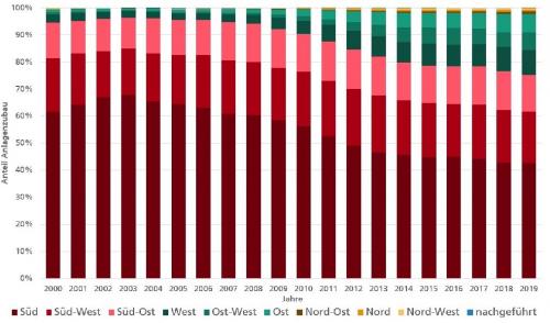 So hat sich die Ausrichtung der neu zugebauten Anlagen seit 2000 verändert zur Vollansicht bitte auf die Grafik klicken Grafik: Fraunhofer ISE |