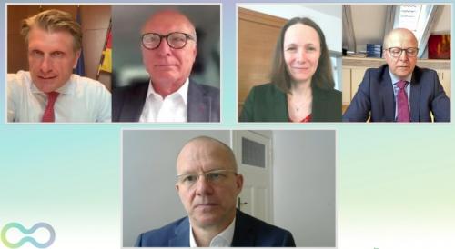 Die Diskutanten auf dem Wasserstoffgipfel (v.l.o.): Thomas Bareiß (BMWi), Bernd Westphal (SPD), Ingrid Nestle (Grüne), Michael Theurer (FDP), Moderator Klaus Stratmann. Bild: Handelsblatt |