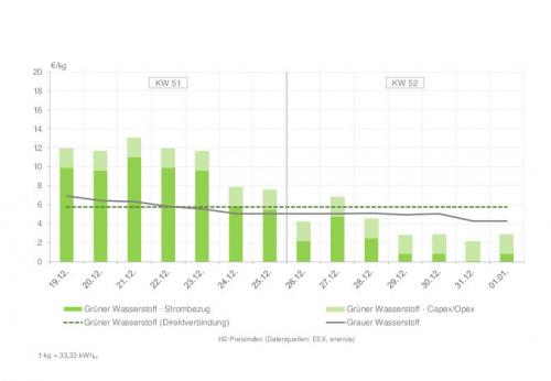 | Wasserstoffpreisindex in den Kalenderwochen 51 und 52 Zur Vollansicht bitte auf die Grafik klicken Quelle: enervis energy advisors GmbH / EEX |
