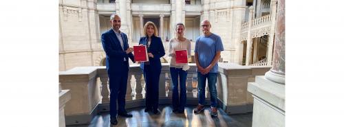 Steigen schneller aus der Kohle aus: (von links) Hannovers Oberbürgermeister Belit Onay, Enercity-Vorstandsvorsitzende Susanna Zapreva, Johanna Gefäller und Stephan Barlag (beide "hannover erneuerbar") Quelle: Enercity |