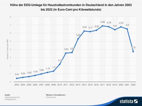 Im Jahr 2022 bezahlen Privathaushalte in Deutschland 3,72 Cent pro Kilowattstunde Strom für die EEG-Umlage. Die EEG-Umlage dient der Förderung erneuerbarer Energien nach dem Erneuerbare-Energien-Gesetz. Sie ist Teil des Strompreises und stellt die Differenzkosten zwischen dem Marktpreis für Strom und dem Fördersatz für erneuerbare Energieträger dar.