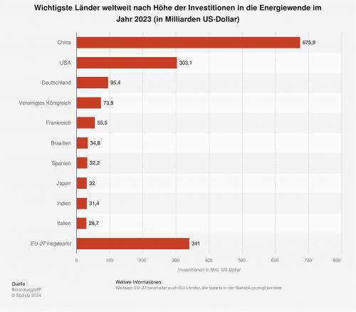 Milliarden US-Dollar Investitionsvolumen einen neuen Rekordwert − knapp die Hälfte der Summe floss dabei nach China. Die USA lagen weit abgeschlagen an zweiter Stelle, gefolgt von Deutschland auf Platz drei.