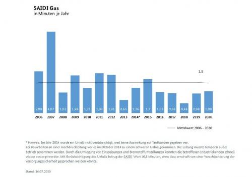 Der Wert der ungeplanten Unterbrechungen in der Gasversorgung liegt auch 2020 mit rund einer Minute leicht unter dem langjährigen Mittel von 1,5