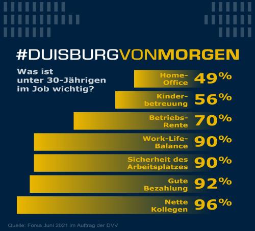 % der Befragten unter 30 Jahren bei der DVV-Studie „#duisburgvonmorgen“ an, die von Forsa durchgeführt wurde. Das Homeoffice landet bei der Generation U30 eher unten auf der Liste: Nur knapp die Hälfte gab an, dass ihnen die Möglichkeiten für Homeoffice „wichtig oder sogar sehr wichtig“ seien.