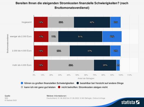 Wegen des Krieges in der Ukraine sowie der steigenden Inflationsrate sind die Energiepreise im Jahr 2022 in die Höhe geschossen. Mit verschiedenen Entlastungspaketen versucht die Bundesregierung, die Folgen der Preissteigerungen abzufedern. Laut einer im Sommer 2022 erhobenen Umfrage des WSI (Wirtschafts- und Sozialwissenschaftliches Institut) führten die steigenden Stromkosten bei rund 12