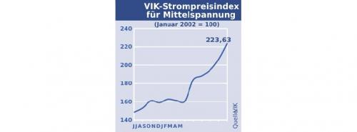 Wie der Verband der Industriellen Energie- und Kraftwirtschaft (VIK) mitteilte, gewann der Index gegenüber dem Vormonat um 17,2 Punkte oder 7,7 Prozent auf 223,63 Punkte. Der gleitende Jahresdurchschnitt für den VIK-Basisindex liegt im aktuellen Monat bei 177,25 Punkten.