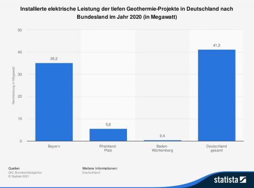 Die Statistik zeigt die installierte elektrische Leistung der tiefen Geothermie-Projekte in Deutschland nach Bundesland im Jahr 2020. Im genannten Jahr betrug laut Bundesverband Geothermie und Bundesnetzagentur die installierte Leistung der tiefen Geothermieanlagen zur Stromerzeugung im Bundesland Bayern rund 35,2