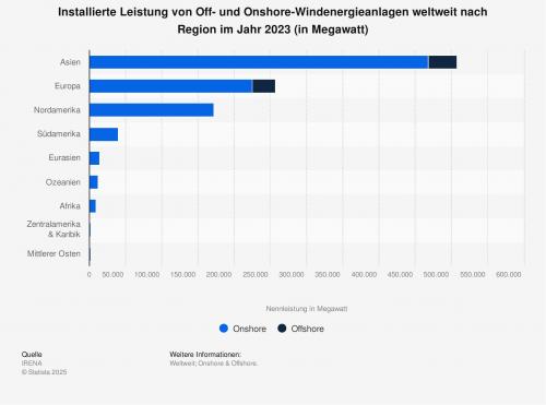 Die Statistik zeigt die installierte Leistung von Off- und Onshore-Windenergieanlagen im Jahr 2023 nach Regionen weltweit. Im Jahr 2023 verfügten die Onshore-Windenergieanlagen in Nordamerika über eine Leistung von rund 172 Gigawatt. Quelle: Statista