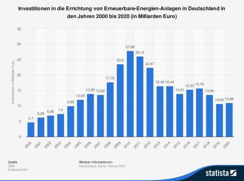 Die Statistik zeigt die Entwicklung der Investitionen in die Anlagenerrichtung zur Nutzung erneuerbarer Energien in Deutschland in den Jahren 2000 bis 2020. Im Jahr 2020 wurden demnach in Deutschland rund 11
