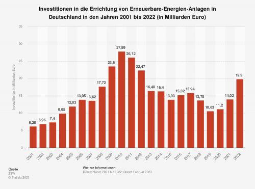 Die Statistik zeigt die Entwicklung der Investitionen in die Anlagenerrichtung zur Nutzung Erneuerbarer Energien in Deutschland in den Jahren 2001 bis 2022 nach Zahlen des Zentrum für Sonnenenergie- und Wasserstoffforschung (ZSW). Im Jahr 2022 wurden in Deutschland rund 19,9