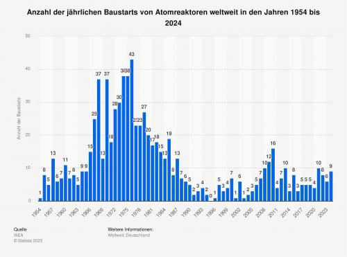Die Statistik zeigt die Anzahl der jährlichen Baustarts von Atomreaktoren weltweit in den Jahren 1954 bis 2024. Im Jahr 2024 wurde weltweit mit dem Bau von neun Atomreaktoren begonnen.