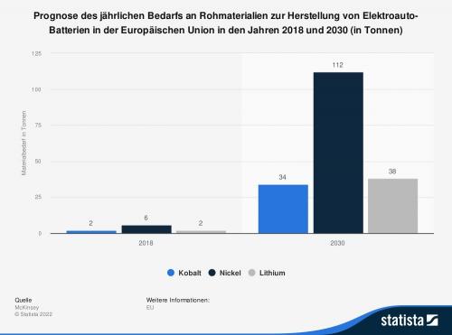 Bedarf an Rohmaterial für Elektroauto-Batterien wächst rasant: Laut einer Prognose des Beratungshauses McKinsey & Company soll der EU-weite Bedarf an Nickel zur Herstellung von Lithium-Ionen-Batterien im Jahr 2030 bei 112