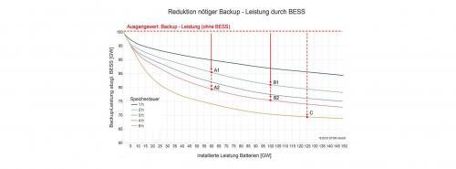 Demnach könnten bereits 60.000 MW installierte Kurzzeitspeicher mit einer Kapazität von zwei bis vier Stunden den Bedarf an gesicherter Backup-Leistung um 15.000 bis 20.000 MW senken. Steige die installierte Speicherkapazität auf 100 GW, würde sich der Bedarf um bis zu 24.000 MW reduzieren.