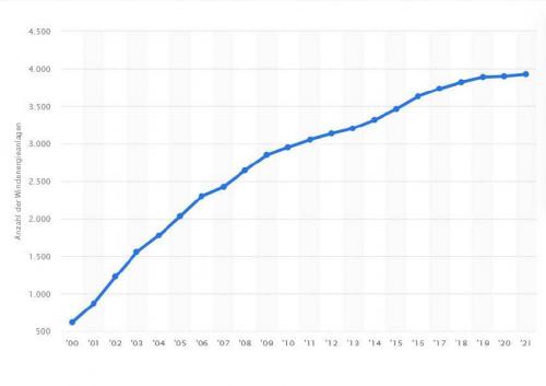 Anzahl der Windkraftanlagen in Brandenburg von 2000-2021 Zum Vergrößern bitte auf die Grafik klicken Quelle: Statista |