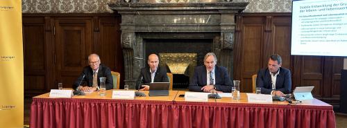 Leipzigs OB Burkhard Jung (2.v.r.) konnte gute Zahlen verkünden, sieht jedoch die Finanzierung der Wärmewende in der Zukunft kritisch. Weiter von links: Volkmar Müller, Karsten Rogall und Frank Viereckl, Leiter der Konzernkommunikation der Leipziger Gruppe Quelle: Frank Urbansky |