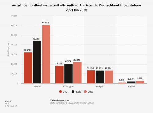 Januar). Die Werte stammen vom Kraftfahrbundesamt. So waren Anfang des Jahres 2023 insgesamt rund 60.800 Lkw mit einem Elektroantrieb in Deutschland registriert. Zwar steigt die Zahl der Lkw mit alternativem Antrieb, der Großteil der Lastkraftwagen wird aber weiterhin mit Diesel betrieben.