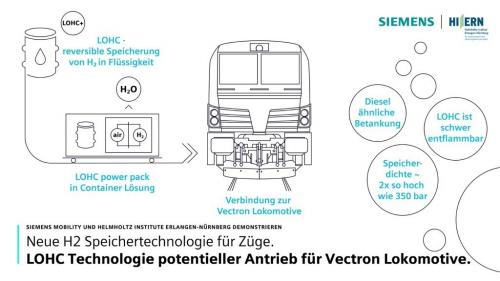 Prof. Peter Wasserscheid, Direktor am Helmholtz-Institut Erlangen-Nürnberg für Erneuerbare Energien (HI ERN): „Das Interesse von Siemens Mobility an der LOHC-Technologie, die wir in den vergangenen Jahren an der Friedrich-Alexander-Universität Erlangen-Nürnberg und am HI ERN entscheidend vorangebracht haben, bildet eine hervorragende Grundlage für eine mögliche Zusammenarbeit in Zukunft.“ Man teile mit Siemens Mobility die technologische Vision einer Wasserstoffmobilität für große Fahrzeuge, die unter Verwendung der bereits existierenden Kraftstoffinfrastruktur realisiert werden kann.