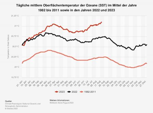 Grad Celsius durchschnittlicher Oberflächentemperatur und damit relativ moderat begann, schnellten die Temperaturen ab Mitte März extrem nach oben. In den Monaten März bis August lagen die Mittelwerte der Oberflächentemperatur aller Ozeane nach Zahlen von Climate Reanalyzer und National Oceanic and Atmospheric Administration so hoch wie noch nie zuvor seit Beginn der Messungen in den 1980er Jahren. Unter Expertinnen und Experten herrscht (Stand August 2023) keine Klarheit über die Ursachen für den ungewöhnlichen Anstieg. Die Temperaturrekorde folgen auf ein Rekordjahr mit Blick auf Eisverlust in der Antarktis.