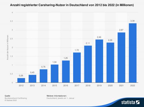 Die Anzahl registrierter Nutzer von Carsharing-Diensten in Deutschland stieg mit Stand Januar 2022 im Vergleich zum gesamten Vorjahr um etwa 18