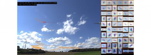 So nimmt die Stereokamera von Bird Vision den Flug eines Mäusebussards im Gefahrenbereich eines deutschen Windparks auf. Die orangefarbenen, mit Zeitpunkten und Entfernungen versehenen Flugbewegungen - hier 80 Sekunden - sind für die Vögel noch nicht gefährlich. Um 16.41 Uhr sieht die Kamera in 150 Metern Entfernung Rot: Alarm! Das Windrad wird dann automatisch heruntergefahren (Bilderfolge vom 29. Juli). Quelle: Bürgerwindpark Hohenlohe GmbH |