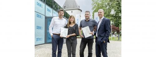 v.l.n.r.: Bastian Stegemann (Leiter des Bereichs Wärme), Daniela Nowack und Benjamin Dudler (Bereich Energiewirtschaft und Wärmeinfrastruktur) und Peter Flosbach (Technischer Geschäftsführer von DEW21) mit den Förderbescheiden Quelle: DEW21 |