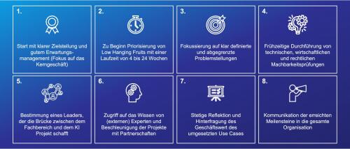 Die Umsetzung von KI-Anwendungsfällen ist ein Prozess, bei dem verschiedene Faktoren berücksichtigt werden müssen – auch die Möglichkeit, dass KI-Algorithmen nicht der beste Ansatz sind. Zusätzlich bestehen neben den regulatorischen und organisatorischen Aspekten weiterhin viele Herausforderungen, insbesondere hinsichtlich verfügbarer Daten, deren Qualität und Verteilung über die Zeit. Um diese zu meistern, sind folgende 8 Erfolgskriterien für die Durchführung von KI-Projekten entscheidend. Diese sind auf der Grafik untenstehend zu finden:
